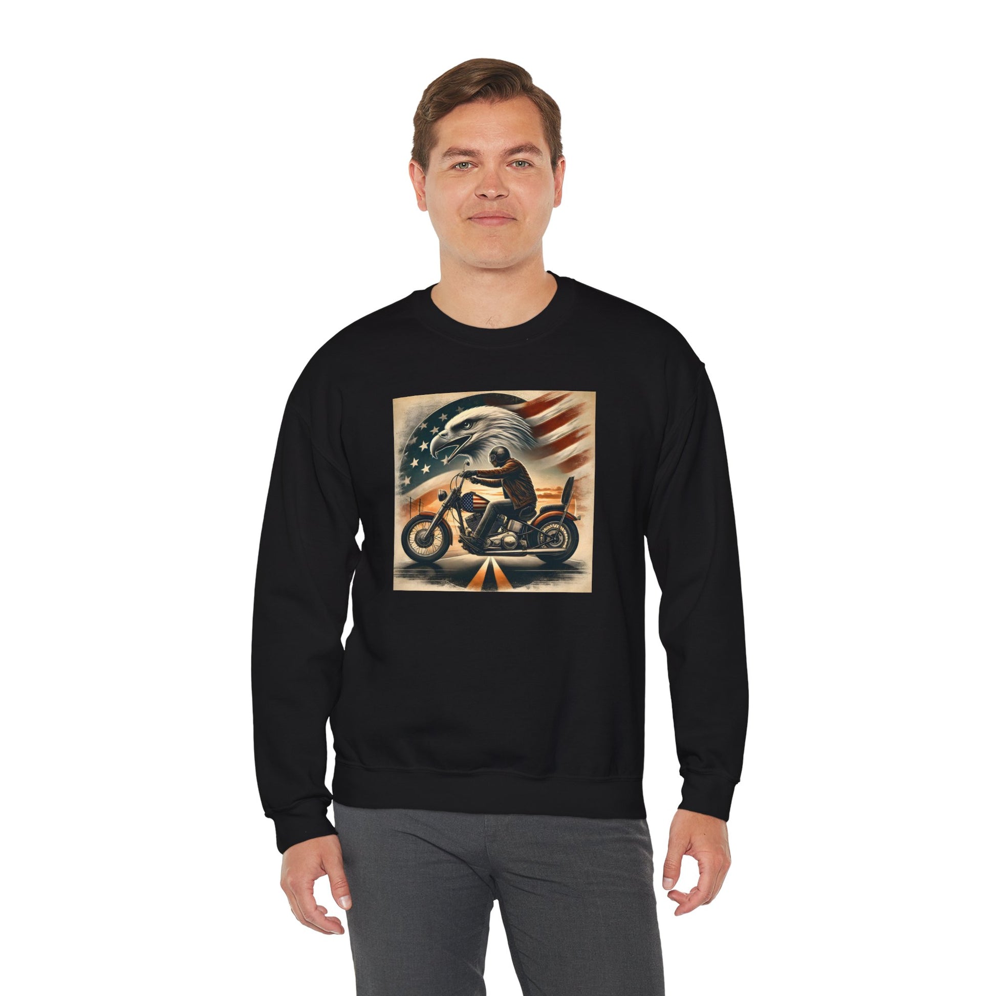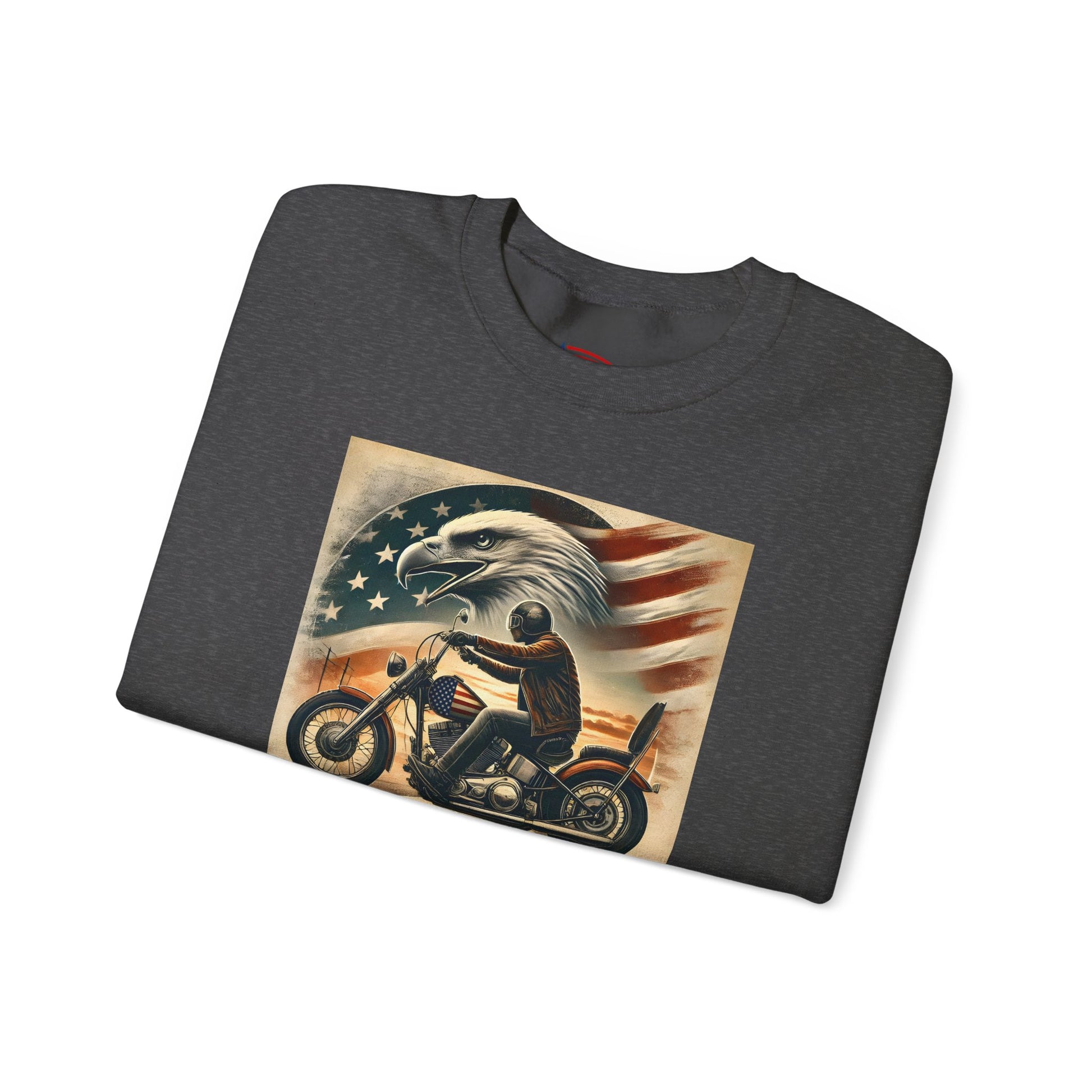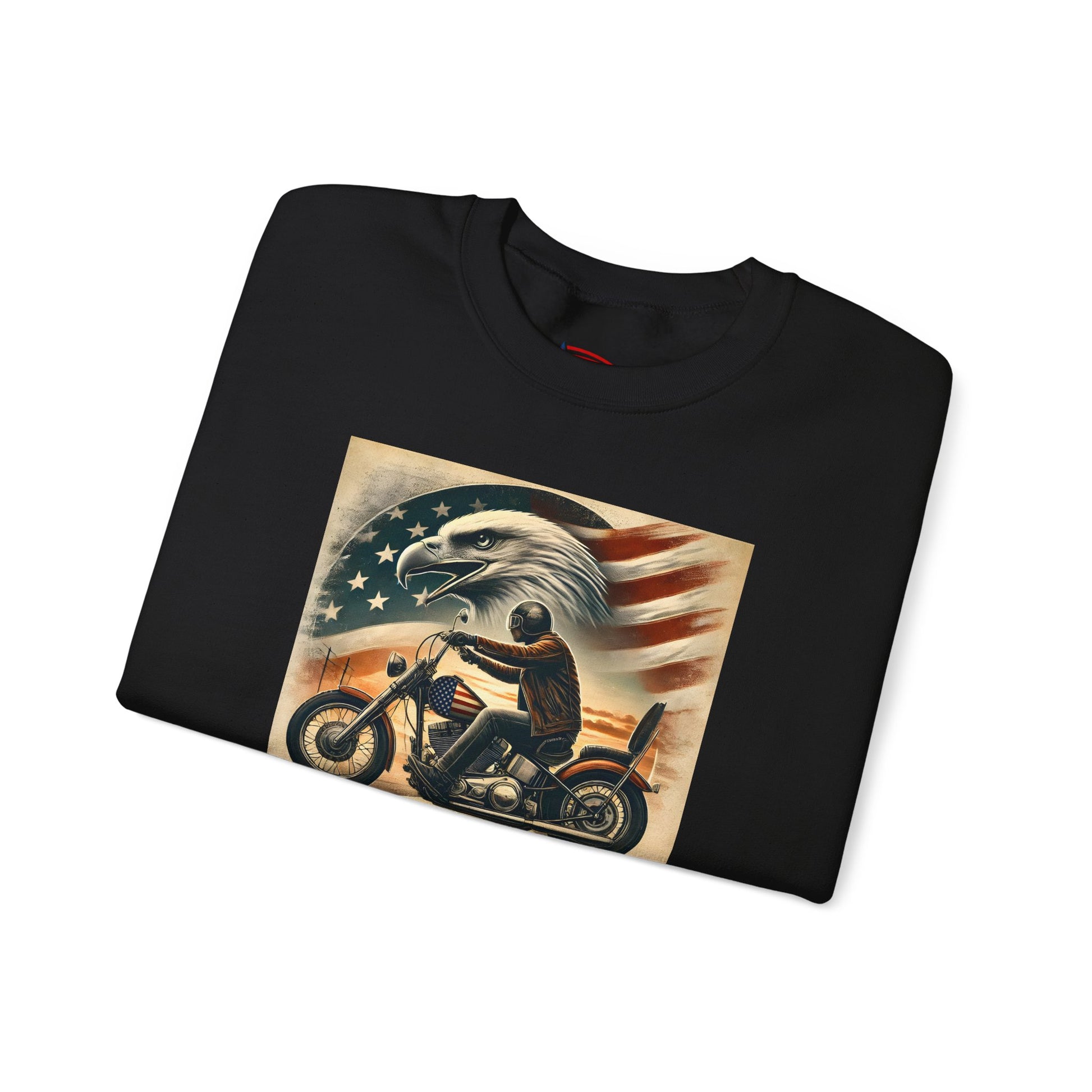 This crewneck sweatshirt channels a raw, patriotic biker spirit—bold, weathered, and unapologetic. Front art captures a lone rider cutting through dusk with American eagle and faded flag backdrop; the back shows a winged skull framed by vintage typography that reads RIDE FREE / LIVE PROUD / DIE AMERICAN — attitude printed into the fabric and ready for long rides, garage hangs, and open-road evenings. Subtle details like tear-away labels, reinforced double-needle seams, and ethical cotton sourcing make this sweatshirt feel thoughtful as well as tough.