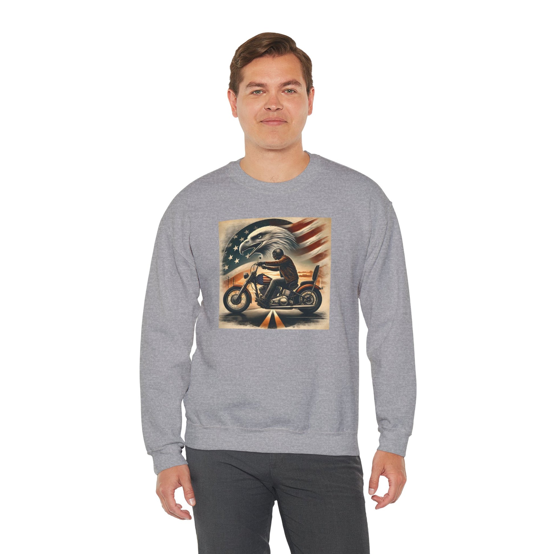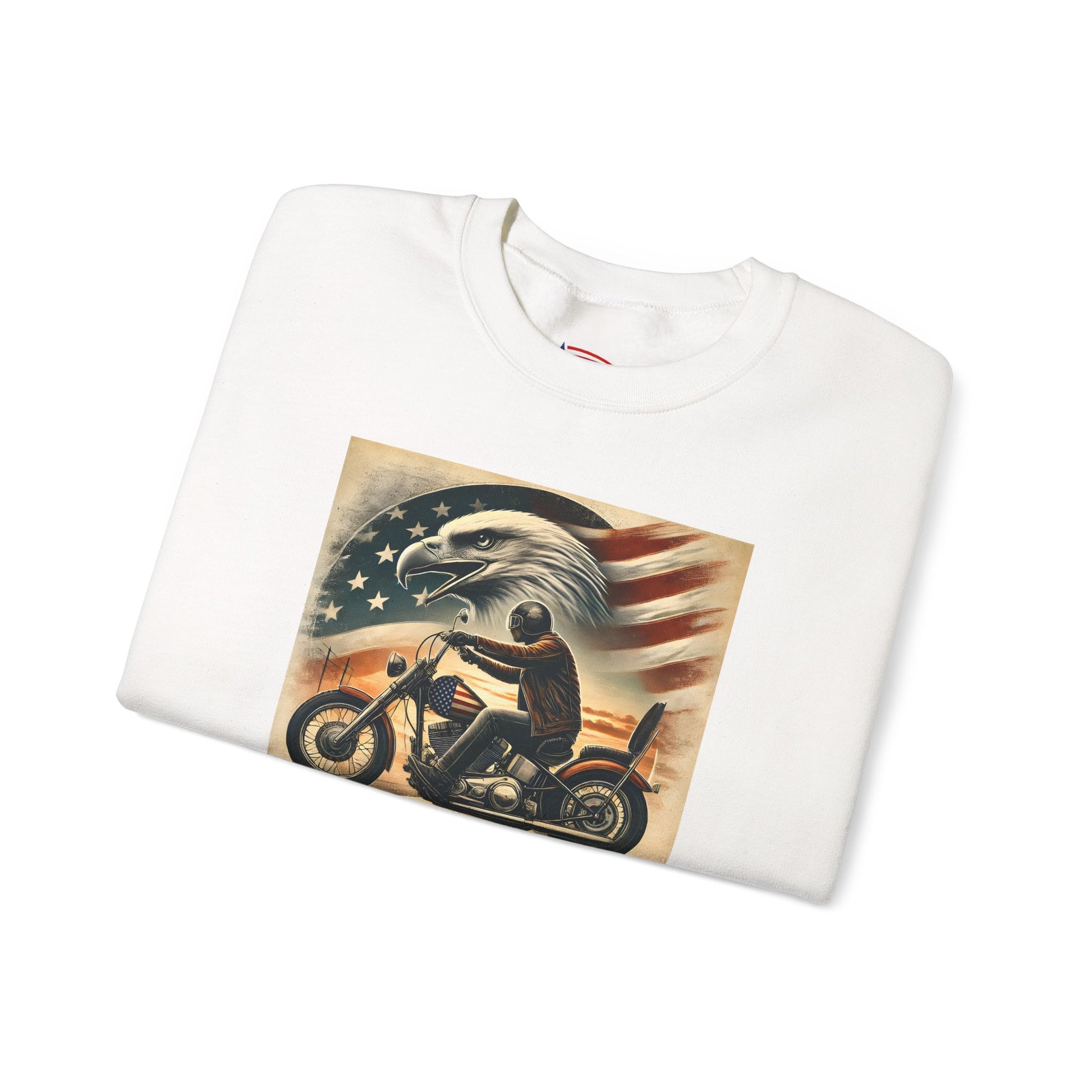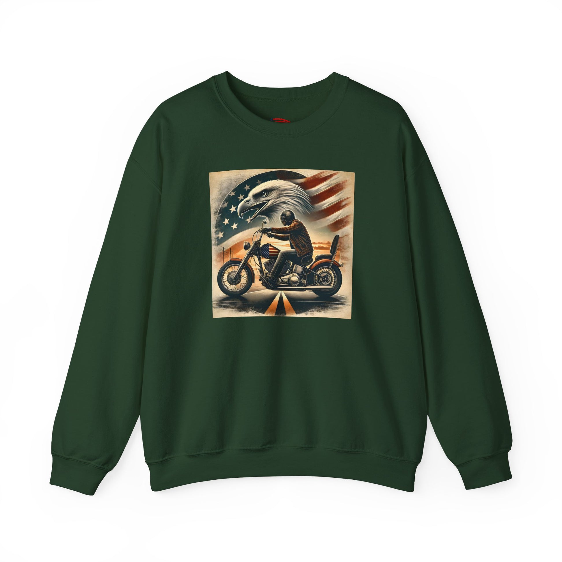 This crewneck sweatshirt channels a raw, patriotic biker spirit—bold, weathered, and unapologetic. Front art captures a lone rider cutting through dusk with American eagle and faded flag backdrop; the back shows a winged skull framed by vintage typography that reads RIDE FREE / LIVE PROUD / DIE AMERICAN — attitude printed into the fabric and ready for long rides, garage hangs, and open-road evenings. Subtle details like tear-away labels, reinforced double-needle seams, and ethical cotton sourcing make this sweatshirt feel thoughtful as well as tough.