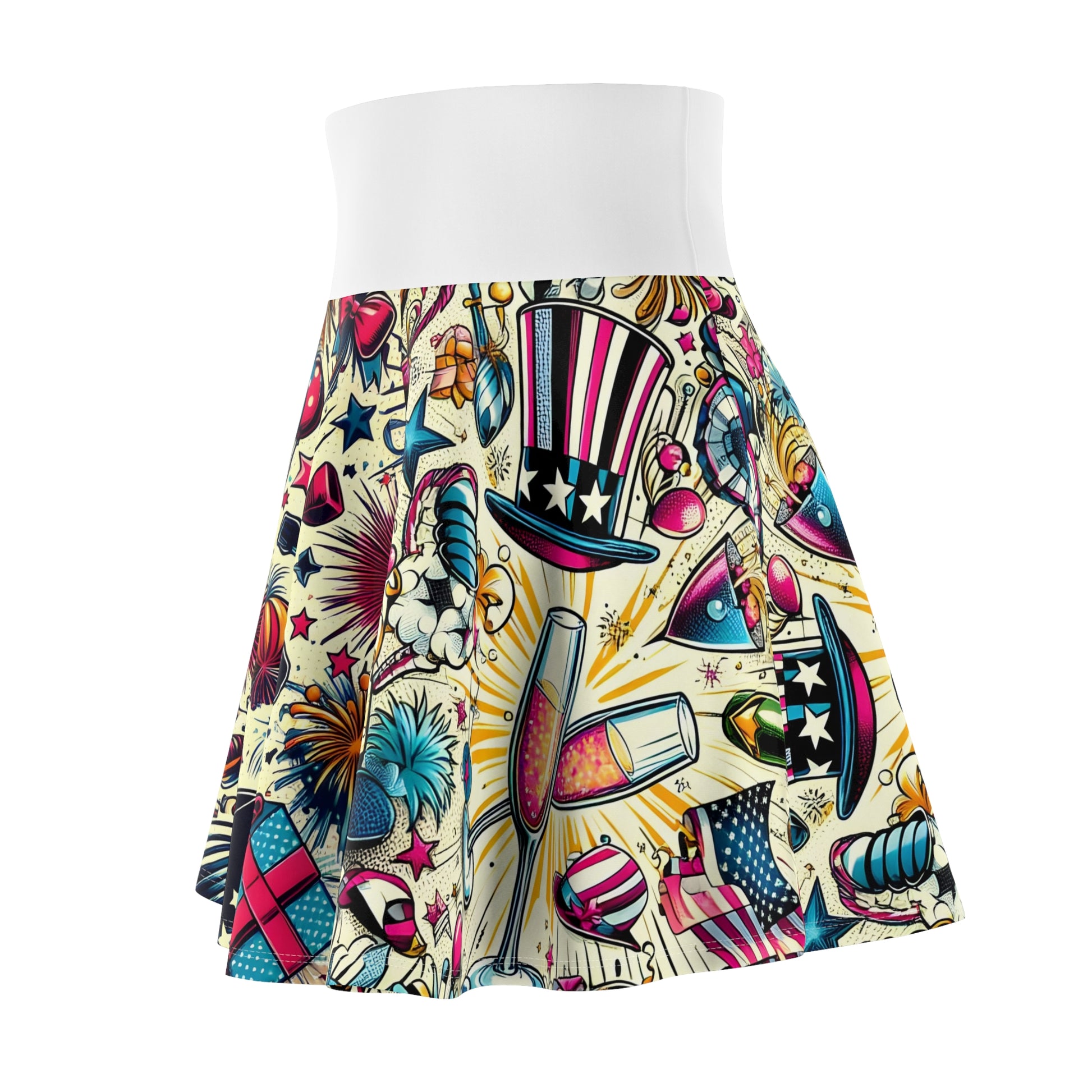 Twirl into the New Year with Style! Make a grand entrance at your next party with our Pop Art Celebration Skater Skirt. This high-energy piece features a vibrant, seamless pattern packed with everything you need for a perfect countdown: clinking champagne glasses, explosive fireworks, festive top hats, and patriotic stars and stripes.