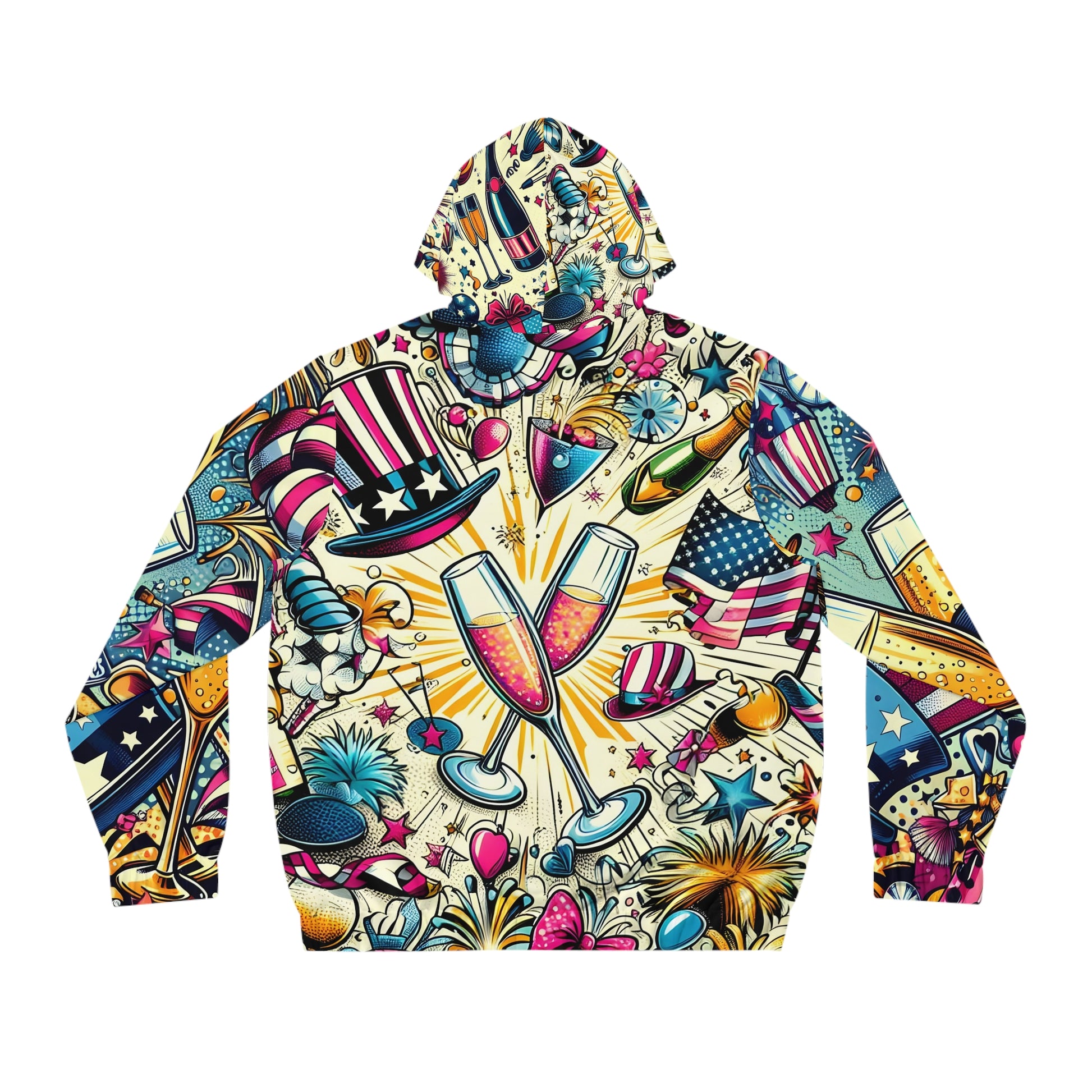 Celebrate in Style! Step into the new year with a burst of energy and vintage flair. This all-over print hoodie features a vibrant, comic-book inspired pattern that blends the excitement of a New Year’s Eve party with a classic Americana aesthetic. From fireworks and champagne toasts to iconic stars-and-stripes top hats, this design is a walking piece of pop art that guarantees you'll be the center of attention at any countdown. Americana edition.